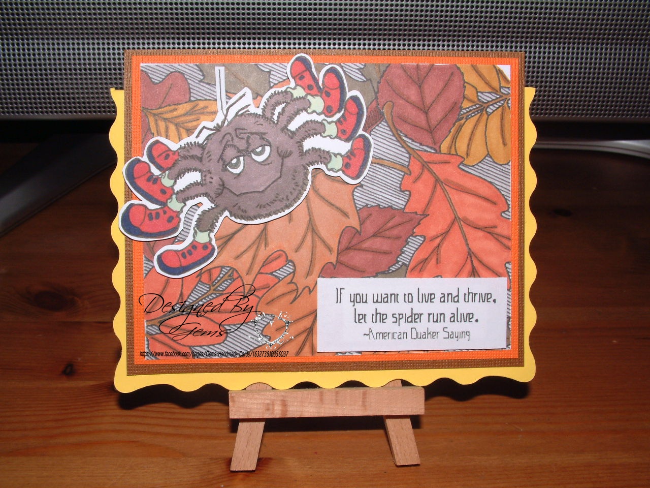 I decided to use a digi stamp from both companies to show how easy they blend together, I used the leaf background http://www.eurekastamps.com/proddetail.php?prod=digi26901, coloured them all in using autumn colours with my pro markers. I added the Spider http://www.qkrstampede.com/proddetail.php?prod=digi12301, then searched on the internet for a little saying that would fit it well, and came across this one. I really like both images together and wanted to show you how easy it is to make one project using both sites.