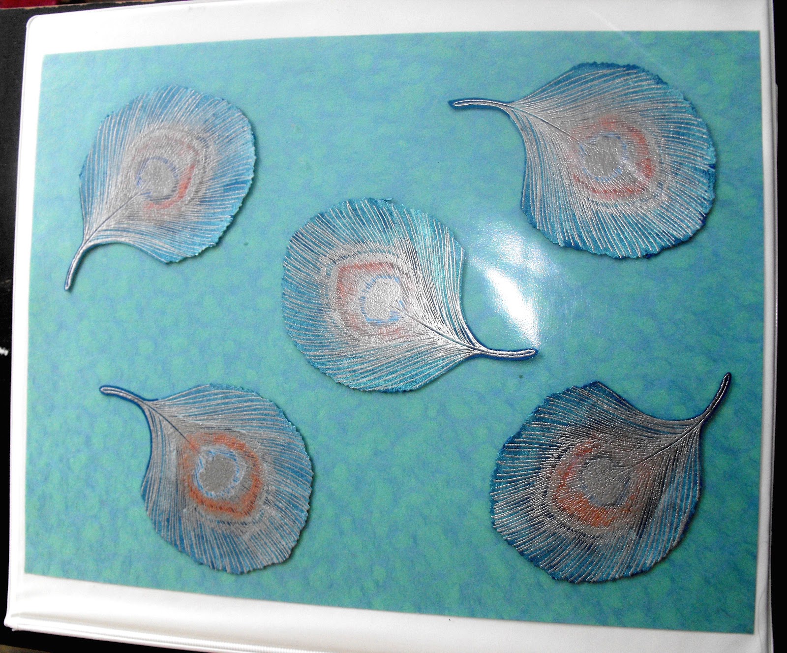 This is a second picture of the peacock album, that I am showing because I like to show problems/errors that teach me. I had rejected a few of these feathers because I had not realized that Opalite inks (interference inks working only on very dark colors) will lose their color and look white if applied to heavily. So if you look closely at the feather on the lower right, you'll see it looks very white in the middle. So, be careful when using these inks!