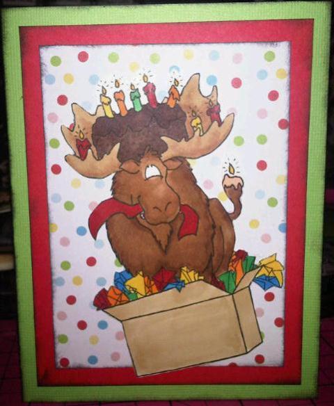 Tory here again with this cute birthday card featuring.... a moose. Seriously! This is what I love about Eureka, they have so many cute critters to work with! I used the Moose in a Box stamp for this card, and paired it with some patterned paper and cardstock, and then inked it all up.