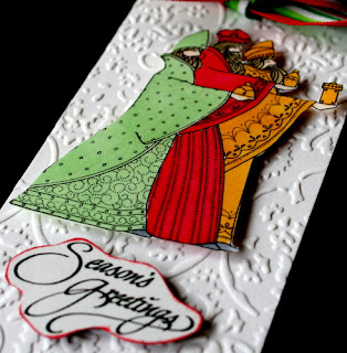 I colored the Three Kings with my Spectrum Noir markers then fussy cut them out. I attached them to my embossed tag with pop dots. The sentiment is also attached with pop dots. Here is a close-up of the images: