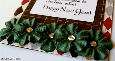Isn't this large sentiment wonderful and just perfect for a New Year's card? I used Echo Park Very Merry Christmas papers and added some Christmas green flowers to my card. I jazzed the flowers up a little with a rhinestone in the center of each one. The flower in the upper right hand corner is attached with a pop dot. Here's a close-up photograph of the lovely sentiment.