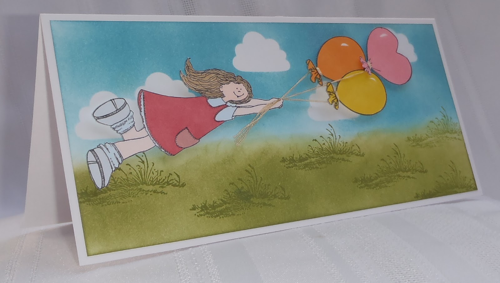 The girl and balloons were fussy cut and adhered to the card with foam tape.