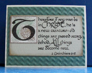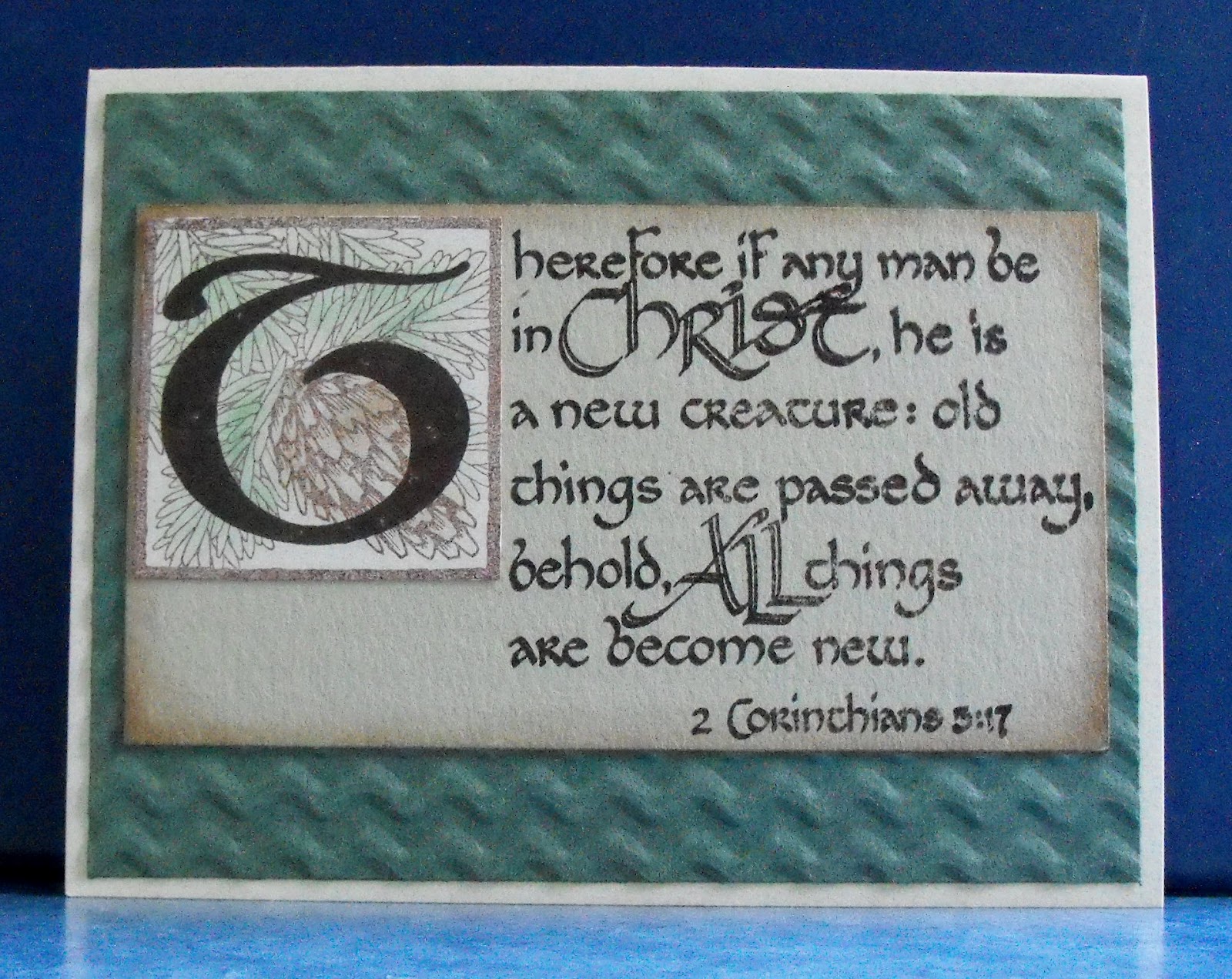 I have been taking classes online at Regent University for a couple of years, and I wanted to make a card for my favorite professor. I chose the 2 Corinthians 5:17 stamp because I had to write a ten page paper on this verse for him; I'm so glad Eureka carries it! The card was far less time consuming to do than the paper, lol! Along with the alphabet set, in which letters are also available to be purchased individually, Eureka has a number of cubes that can be used for the background. The one I used for this card happens to come from the Winter set of four; I wanted a masculine card, and the pine branch seemed a good fit.
