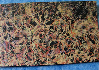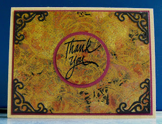 I was looking at my comforter just before going to bed one evening, and thought, "What a pretty card background this would make!" Of course, then I couldn't sleep for awhile thinking about which stamps I would use! I wonder if any other cardmakers have that problem? I knew that I would definitely want to use Eureka's Baroque Background stamp, so I started with that in the morning. I ended up also using the peacock feather and in samples below, the Mosaic background stamp. The background was created using faux batik technique, and sponging brilliance ink dew drop-shaped pads directly onto the cardstock.
